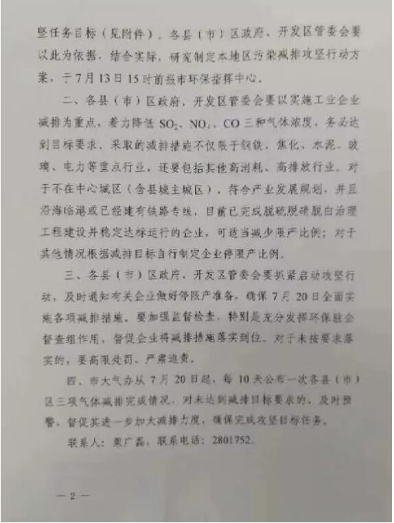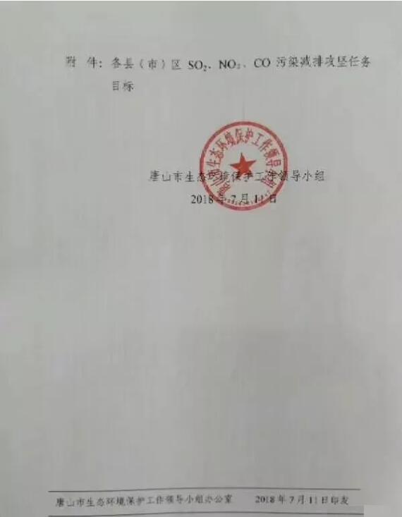 為圓滿完成全年空氣質量改善目標任務,按照2018年7月9日全市“十項重點工作”調度會議精神,唐山市決定自7月20日至8月31日在全市開展SO2、NO2、CO污染減排攻堅行動,具體通知如下: