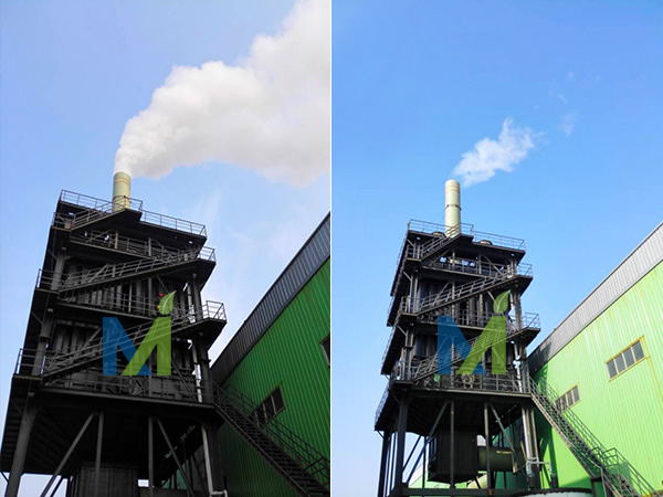 濕電除塵器處理的煙氣為鋅焙砂煙氣,煙氣量50000m3/h,設計氣速為1m/s,除塵效率>90%,左圖為第一臺運行效果,右圖為另一臺5W氣量運行效果