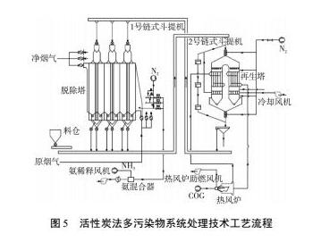 為了降低燃氣的使用量,可以采取煙氣循環燒結(如圖4所示),可減少約25%的煙氣排放量,相應降低加熱煙氣所需的燃氣量,同時降低脫硫及脫硝的投資建設成本2.2活性炭法多污染物協同處理技術活性炭吸附法技術工藝簡單,占地面積小,是一種可同時去除粉塵、Nox、SO2等多污染物的煙氣凈化技術,且該技術資源化利用率高,副產物為高濃度SO2氣體,可用于制備濃硫酸或其它高附加值的單質硫等,具有良好的發展前景。 活性炭多污染物協同處理技術由吸附系統、解析系統、輸送系統和硫資源化利用系統組成。煙氣由增壓風機引入吸附塔,氨氣在吸附塔入口加入,SO2、Nox、粉塵、二噁英、重金屬等污染物脫除在吸附塔內完成。吸收了污染物的的活性炭通過輸送系統送往解析塔,在430℃氮氣氣氛下對活性炭進行加熱解析,產生富含SO2氣體,同時可以分解約70%的二噁英,活性炭經篩分后重新利用,篩下物可送往高爐或燒結作為燃料使用,工藝流程如圖5所示。