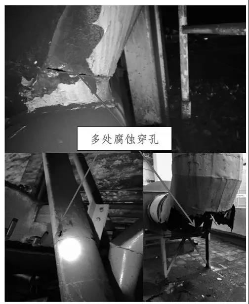 某沿海火力發(fā)電廠輸煤系統(tǒng)的干式靜電除塵器使用的是福建衛(wèi)東環(huán)保科技股份有限公司生產(chǎn)的MZZ4-2型高壓干式靜電除塵器,2007年投用,采用的是四電場立式結(jié)構(gòu),電場采用L型SPCC板和管狀針刺線,同極間距110mm,風(fēng)量24000m3,出口含塵量90mg/m3。隨著該廠大量使用印尼煤(每年占60%),設(shè)備腐蝕情況尤為嚴(yán)重,兩臺除塵器的除塵效率、除塵效果和防火防爆要求已不能滿足當(dāng)前運(yùn)行工況。目前干式靜電除塵器主要存在殼體、風(fēng)管多處腐蝕穿孔(風(fēng)管腐蝕見圖1),電場腐蝕變形、脫落等問題。