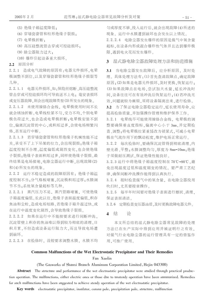 本論文研究了濕式靜電除塵器的結(jié)構(gòu)和性能,根據(jù)生產(chǎn)實(shí)踐歸納了濕式靜電除塵器在運(yùn)行中經(jīng)常出現(xiàn)的故障,包括電氣故障和運(yùn)行不穩(wěn)定造成的故障,并對故障原因進(jìn)行了分析,提出了處理方法和預(yù)防措施,以便達(dá)到提高濕式靜電除塵器運(yùn)行穩(wěn)定性的目的。