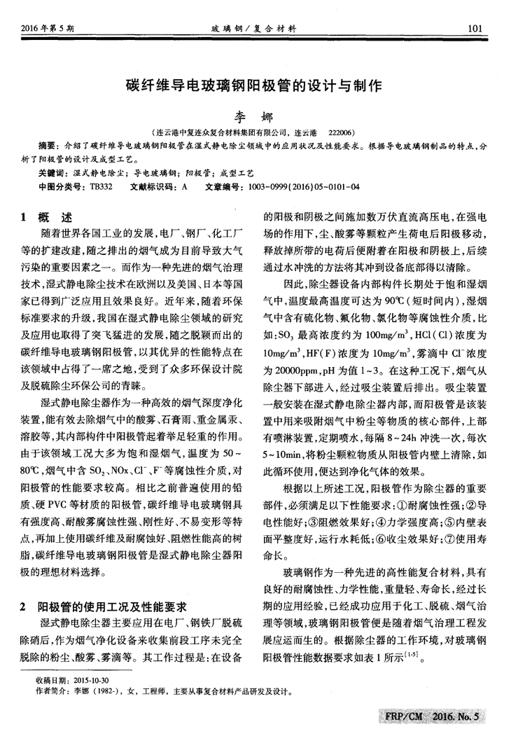 【關(guān)鍵詞】濕式靜電除塵 導(dǎo)電玻璃鋼 陽(yáng)極管 成型工藝